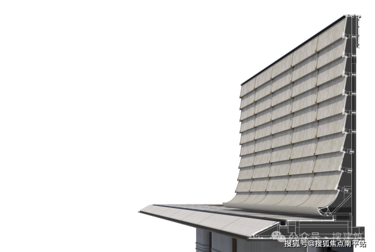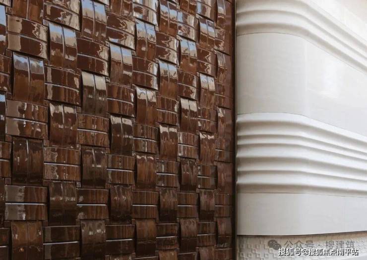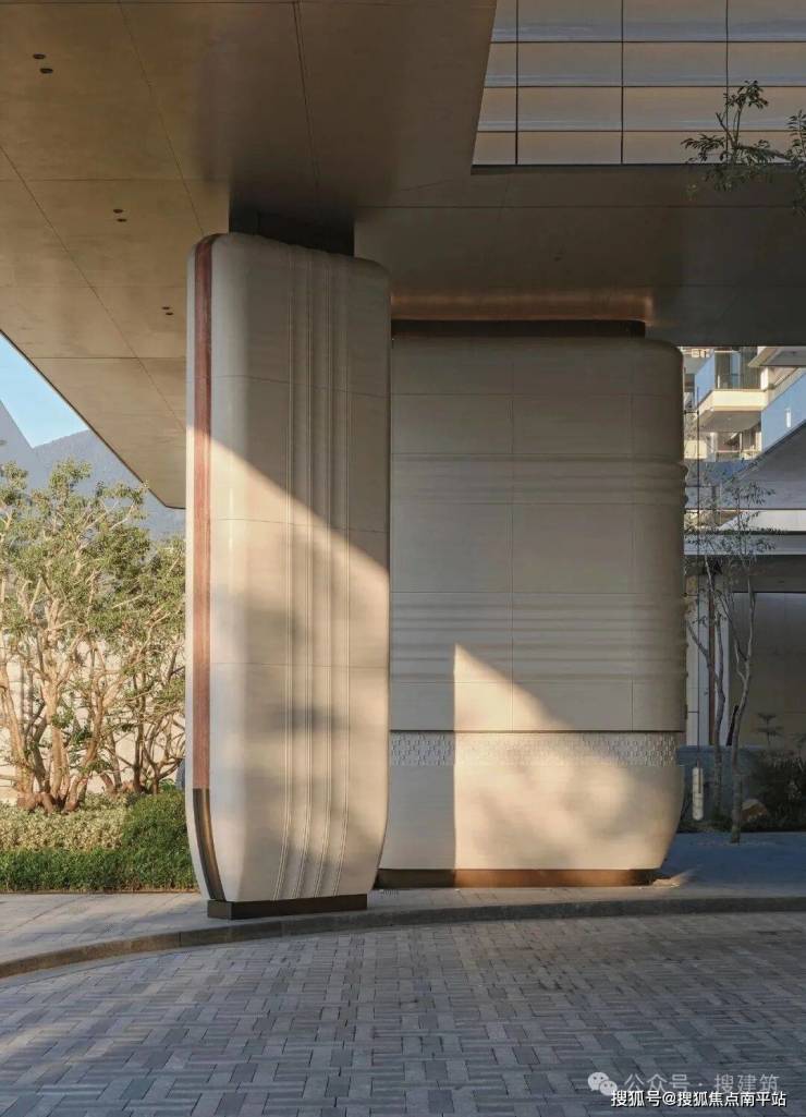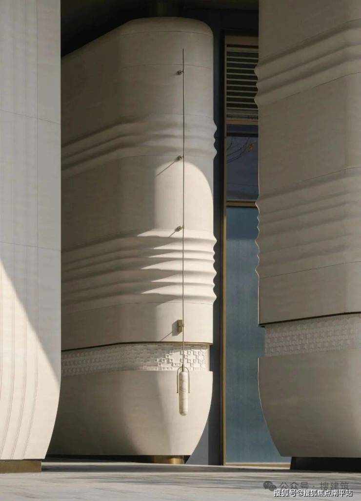 建筑入口顶部的巨大发光顶棚,灵感源自古代海上丝绸之路的帆船。顶棚采用双曲面钢结构,表面覆盖云石玻璃,白天如云朵般轻盈,夜晚则化作海上明灯,营造温暖宁静的归家氛围。建筑立面上带有波浪形凹槽的墙面与柱体,是对海浪形态的抽象表达,随空间走向发生微妙变化,配合灯光投射,呈现出如同呼吸般的光影韵律。