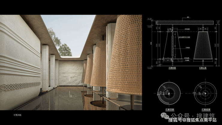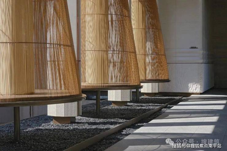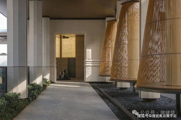 穿过入口门廊,即进入"归心长廊"——一条狭长而幽静的过渡空间。廊道两侧是连续的白色弧形墙,延续"海浪"的波纹肌理,但尺度更为细腻。中央设置狭长镜面水池,水面如镜,倒映天空与建筑。最引人注目的是水池一侧排列的数个3.5米高仿竹编灯笼,其原型来自海南渔民的传统鱼篓。这些灯笼不仅是装饰元素,更是度假节奏调控器,完成从"抵达"到"安顿"的心理转换。