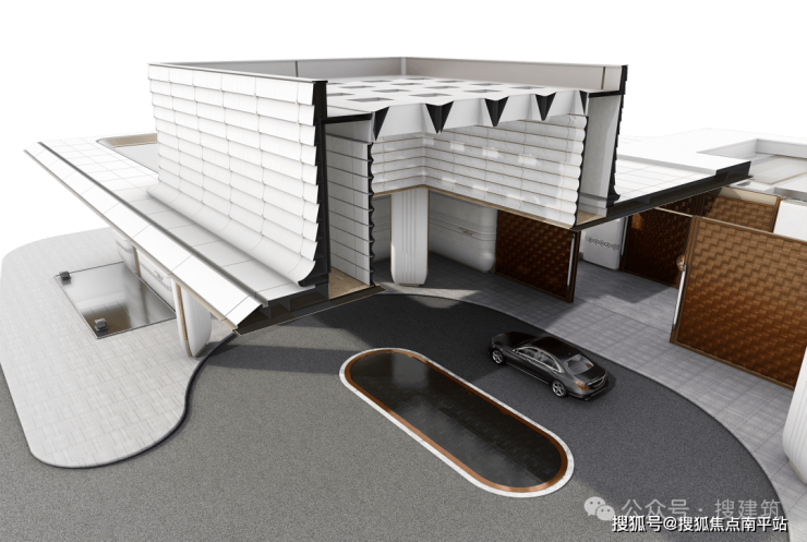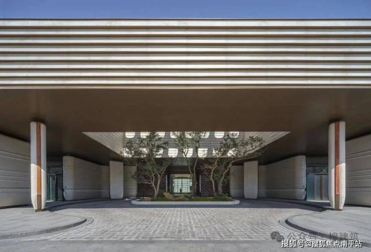 入口广场以人字形铺陈的石板地面为中心,两侧设低矮水渠。主入口摒弃了传统高耸大门或厚重墙体,代之以四根轻盈的弧形柱体,支撑起悬挑屋面。柱体表面采用米白色石材,内嵌红色洞石,散发柔和暖光。柱间空隙巧妙地将视线引向内部庭院的绿意与远处的女王厅,形成强烈的视觉穿透感。这种"半围合"布局既保留入口仪式感,又避免封闭带来的压迫感,宛如一扇缓缓开启的门扉,邀请访客步入全新世界。