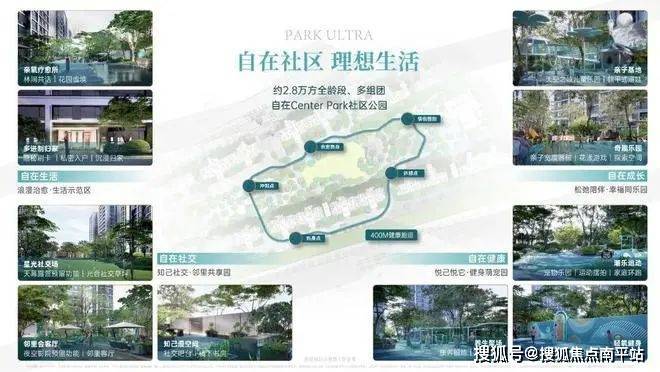 社区景观以“自然、自在、自由“的Center Park城市公园理念,规划约2.8万方全龄段、多组团社区公园谧境,围合布局约1.3万方park ultra中央公园,以自在健康、自在生活、自在社交、自在成长4大功能组团,打造全龄、全功能、全家庭体验的理想生活场域。