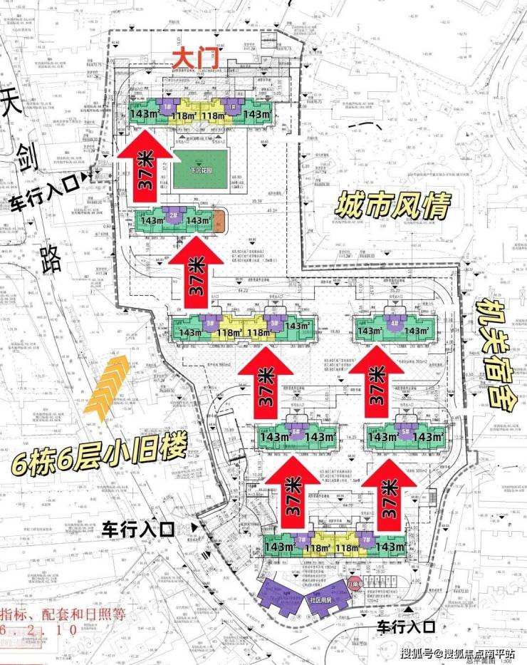 楼间距较窄。整个项目就7栋高层,前后楼间距约37米,这样的距离可能出现两个问题:1、低楼层采光受影响,2、现在标配大落地窗,一眼看清对面楼的邻居家布局。
