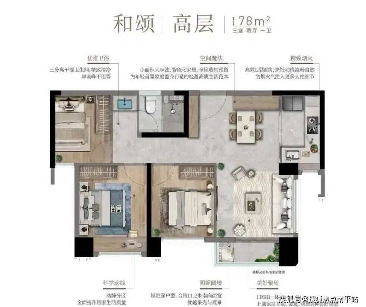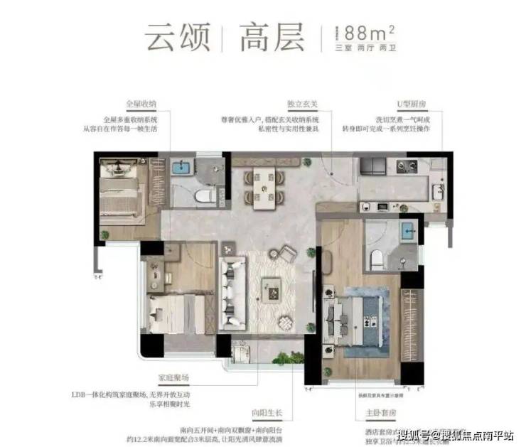 对,就是字面意思。虽然只有一个卫生间,但确保了客餐厅、房间的基本功能和88㎡基本一致,而且卫生间做了干湿分离,三口之家的使用也基本足够。