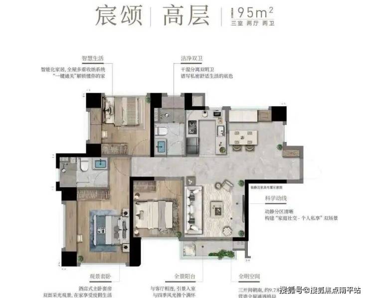 95㎡就是三房刚需改善的户型,南北通透,和凤鸣雅颂和国贸学府锦樾的99㎡户型基本一致,差异就是阳台做在客厅南面,更符合传统生活习惯,也提升了南向次卧的私密性。