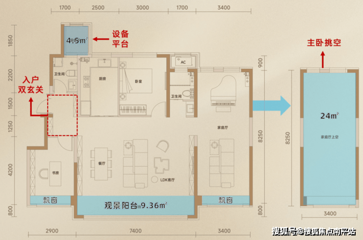 同样的,南向阳台赠送面积达到约9.36㎡,南向双飘窗约3.8㎡、设备平台约4.5㎡。