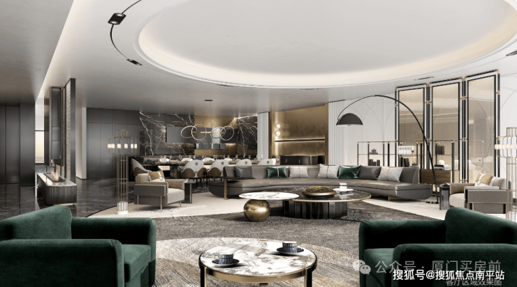 下沉式中庭水景园林、引光影到空间、外挂罗马洞石、满目极尽奢华;