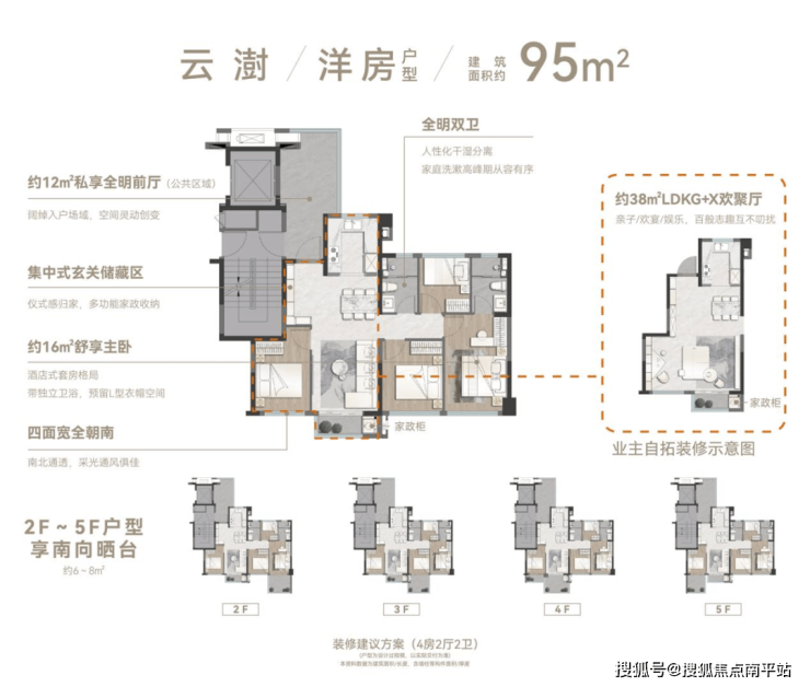 二是洋房有入户花园和类独梯独户配置。入户花园可用来作棋牌茶歇、户外装备区、艺术画廊、微型园林、家政收纳等各种生活场景。联发环岛新澍约95㎡洋房,带约12平入户花园,类独梯独户,归家仪式感拉满。此外2-5层额外配置南向露台,生活场景更多元。
