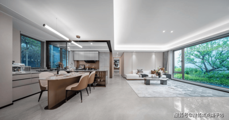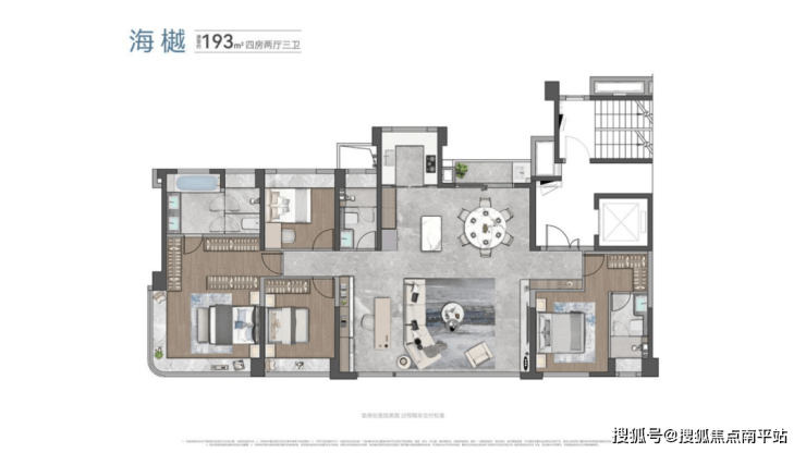 建面约193㎡的四房两厅三卫,处于湾海正席,最大化赋予海沧湾观景视野,真正做到了南面一线无遮挡湾海景观,每一户都能与湾海亲近接触,约20.5米阔绰面宽设计,让湾海全面屏在此呈现。约80㎡LDKB一体化公区配置,大气朗阔的多功能生活主场,可用于会客或家宴。客餐厅地面采用1800×900仿大理石云棕灰纹理瓷砖。无柱曲面主卧套房,270°转角观景凸窗,让湾海景观移步于日常起居。软装设计搭配皮革、木质、岩石、贵金属,运用不同材质的交叠,与空间体量呼应。