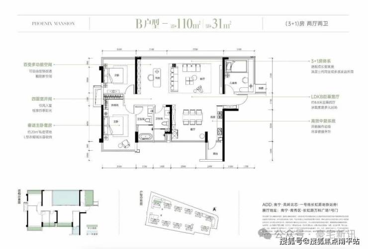 ▋人生进阶:建筑面积约110㎡ 3+1房两厅两卫 可拓展面积31平米 得房率约115%