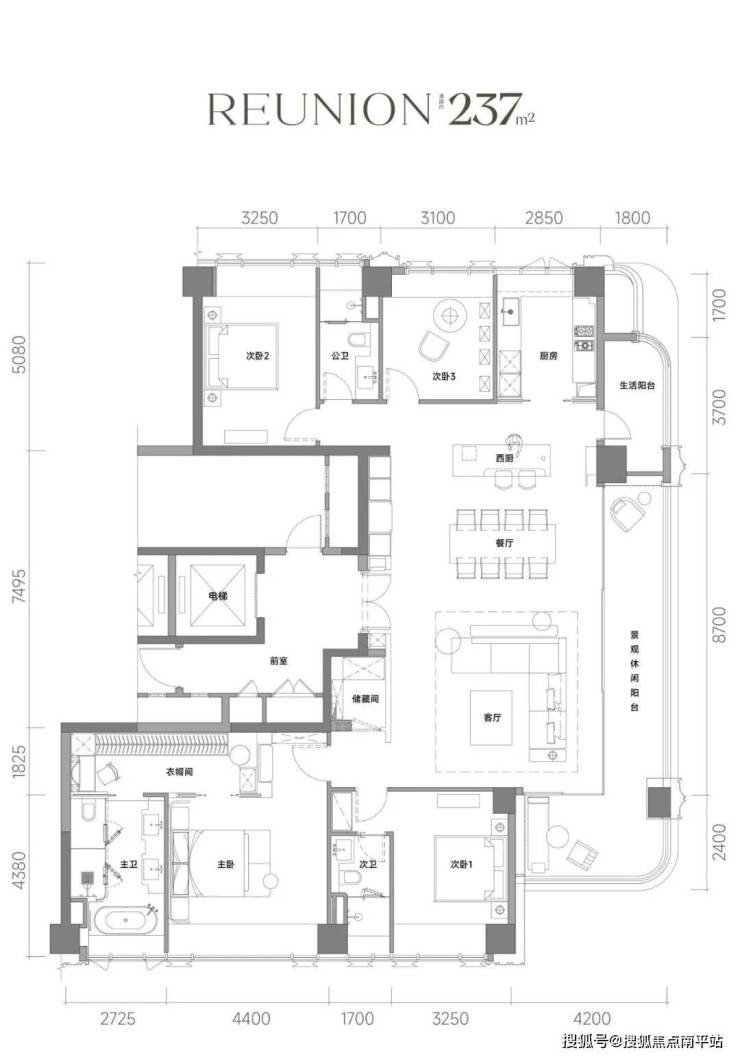 最大的亮点是其面积高达60m²、接近标准羽毛球场大小的 LDKB全景家庭厅 ,以及一个长约18.9米、面积约31m²的L型270°拐角瞰景阳台。