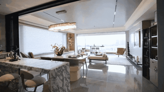 开间和纵深极致拉伸,整个LDGK大方厅尺度达约60平,比汇悦台约280平餐客厅还要阔绰!