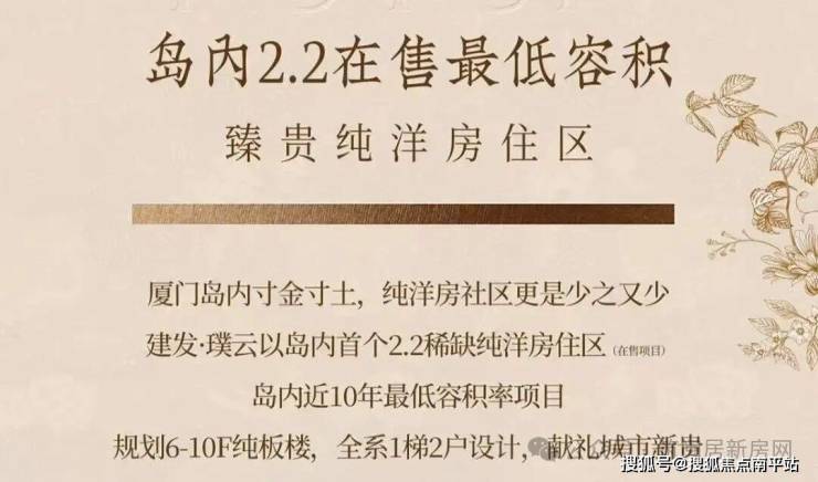 建发于2025年4月24日竞得该地块,命名为“ 建发璞云”整个项目全部设计为洋房产品, 是岛内在售唯一小户纯洋房社区,仅195套,容积率仅2.2,低密度洋房社区项目规划6-10F纯板楼,全系1梯2户设计。最小面积为82㎡,其次为89-100㎡,最大面积也仅为113㎡,空中花园则设计了健身天地、星空观影等区域,满足亲子互动、独处放松等多样化需求。设有休闲座椅、绿化景观和夜景照明系统。架空层规划了茶室、书吧、儿童游乐区等多元功能空间,适合邻里社交、休闲娱乐; 这种“多厅堂”理念让89㎡的户型也能享受以往120㎡以上产品才有的场景体验。