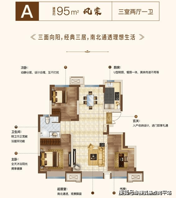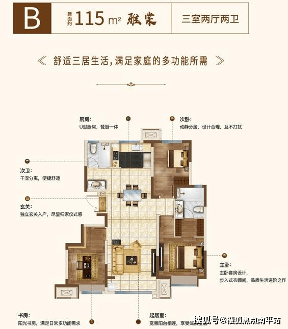 户型全部为三室,面积有95、115、125平米, 均价13000元/平米,最低置业总价110万起。