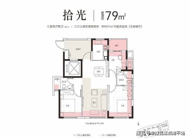 建面约 79㎡三房两卫 :私梯入户,独立前厅可利用,实得面积约 97㎡,得房率 123%,媲美老规 120㎡户型。三开间朝南、动静分区,主卧带观景飘窗,双卫设计避免早高峰拥挤,刚需一步到位。