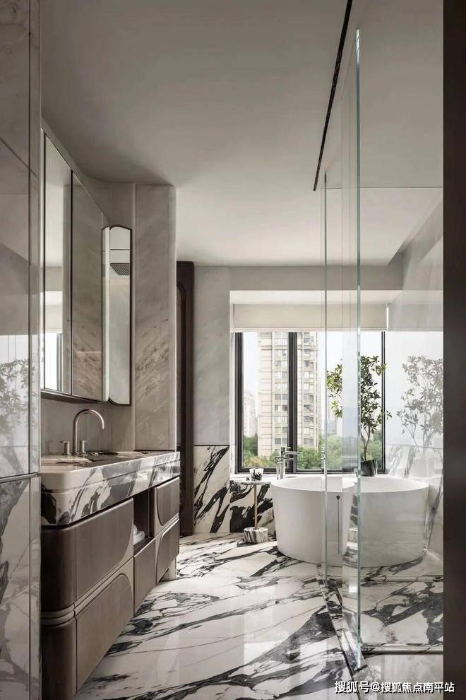 浴室大面积铺陈理石材质,干湿分离的巧思搭配通透玻璃门,既维系了空间整体的和谐质感,又为不同功能区域做出清晰界定。