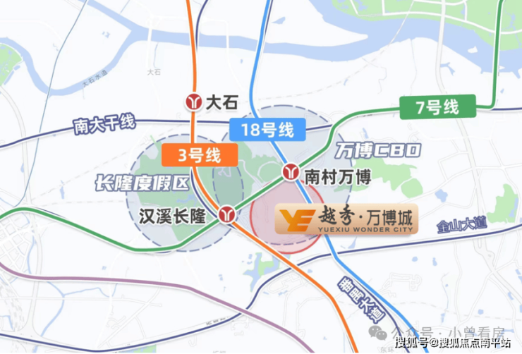 作为越秀地产打造的综合体项目,其坐落于万博 CBD 核心区,汉溪大道旁,土地使用年限自 2024 年 3 月起算,共 70 年,由越秀物业负责后期管理,整体规划涵盖住宅、商业、教育等多种业态。