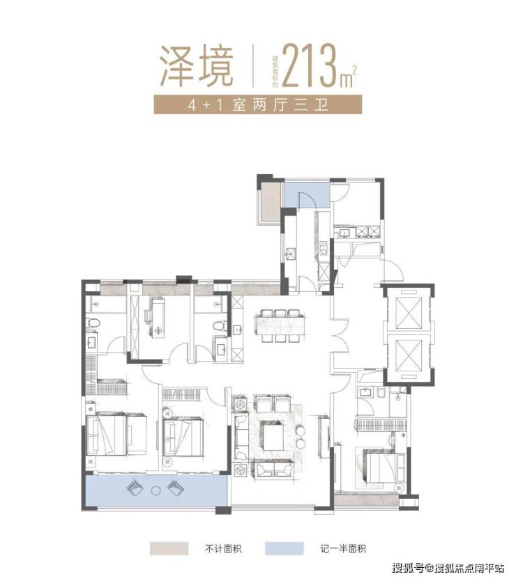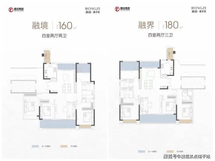我们先看160㎡、180㎡户型,标配大四房,四开间朝南+南北双阳台,通风采光舒适,虽然是老规产品,但赠送了飘窗、设备平台,其中阳台算一半面积,整体的得房都相当高!