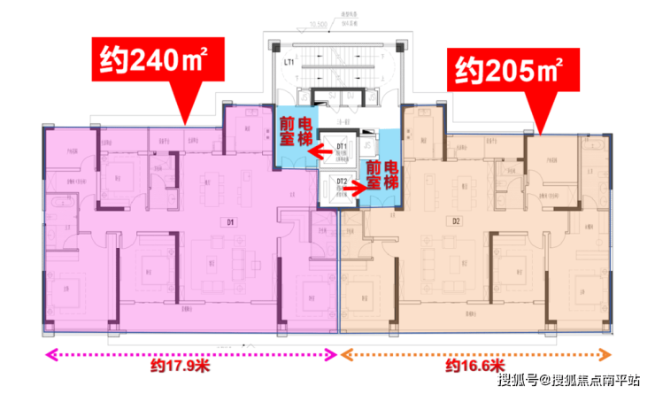 约205㎡为中间户、约240㎡为边户,两梯两户纯板楼,且两部电梯东西错开门设计,相当于私梯入户,外置电梯间可以根据自己的生活需求来进行布置。