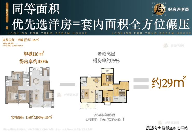 以望樾116㎡为例,得房率突破性达到100%,相比同面积的老款高层,差距整整拉开29㎡。