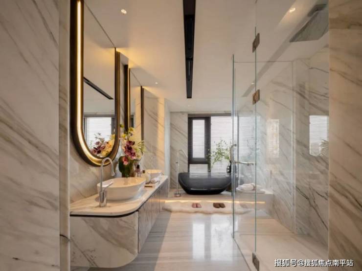 中央庭院以「山涧流水」为主题,太行金堆坡成谷,苔藓与蕨类植物覆其上,营造出「枯山静水」的禅意。景观呈现「近山、中树、远水」的层次,搭配潺潺流水与光影交织,形成了可居可游的立体山水画卷,「自然式造景」颠覆了传统豪宅的刻意设计,让人体验回归自然的松弛宁静。
