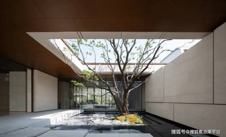 归家大堂门头约45米的超尺度挑檐,简约而不简单,融入了解构南通非遗藤编的细节纹理。入口庭院一颗乌桕破水而出,与两侧的安哥拉黑石水台构成「树宅相守」画卷,营造出极具安缦意境的禅意空间。