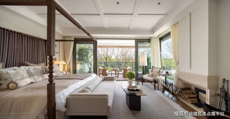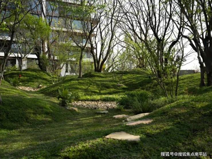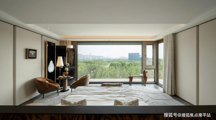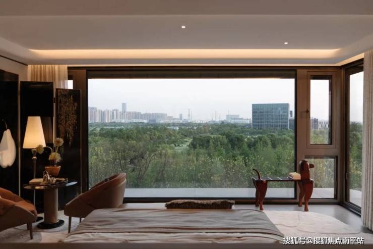 休息室的落地窗外,以玻璃为画框,将香樟林径、环岛铜缸、湖岸水杉林框成一幅层次分明的山水画卷,营造出度假酒店般的松弛感。