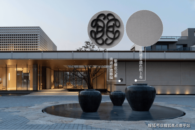 和园还将南通在地文化悄然织入景观脉络。贯穿于社区的专属标识——紫藤花,灵感源自张謇故居濠南别业,象征家族血脉绵延不息。南通非遗藤编工艺与金属烙刻技艺融合,让紫藤花标识在现代空间中绽放新姿;沙漠风石材邂逅南通非遗色织土布工艺,千年文脉以现代建筑语言焕发新生。