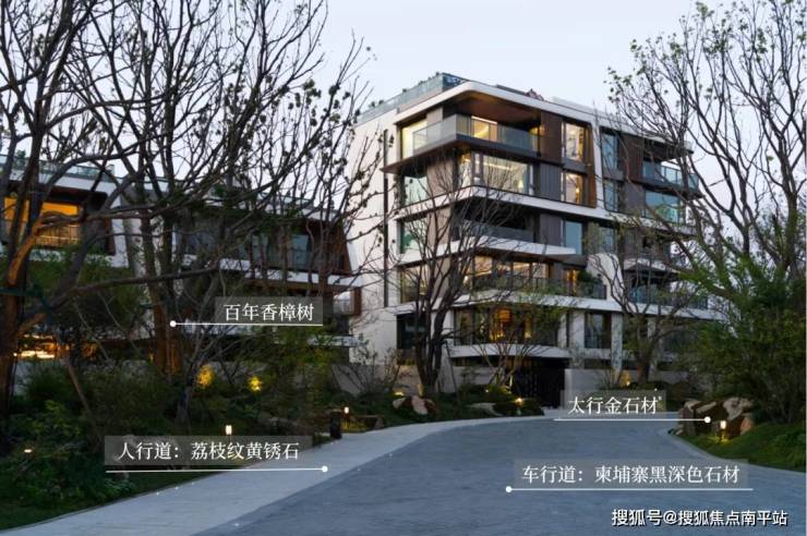 入口处长度约9米的界碑景墙,消弭了社区与自然的界限,由书画泰斗范曾先生亲书的“和园”二字,笔走龙蛇间尽显名家与名园的共鸣。步入其间,一条由百年香樟与太行金石相拥而成的归家林径徐徐展开,精心铺就的荔枝纹黄锈石人行道与柬埔寨黑深色石材车行道,自然纯粹又不乏礼序感。