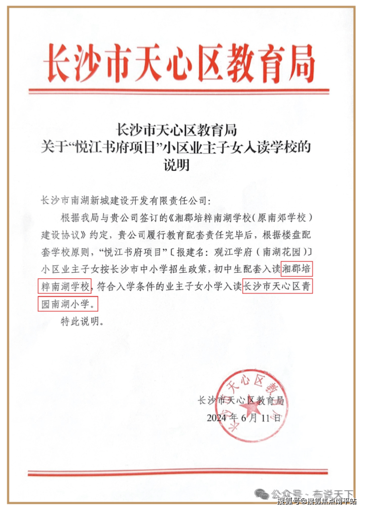 观江学府是目前长沙主城区少数带有名校学位红头文件的新房——小学是青园南湖小学,中学是湘郡培粹南湖学校。