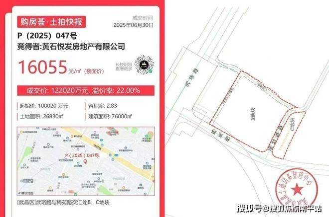 该项目P(2025)047号地块位于武汉市武昌区武珞路与梅苑路交汇处B、C地块,住宅、教育用地。土地面积26830㎡,建筑面积76000㎡,起始价100020万元。是在在2025年6月30日,武汉市举办国有建设用地使用权公开出让活动。福建厦门国企建发集团的关联公司利百控股有限公司旗下黄石悦发房地产有限公司竞价45轮,以总价122020万元竞得武汉P(2025)047号地块(也就是目前的武汉建发·璟玥项目),溢价率22%,成交楼面价16055.26元/㎡拿地价。