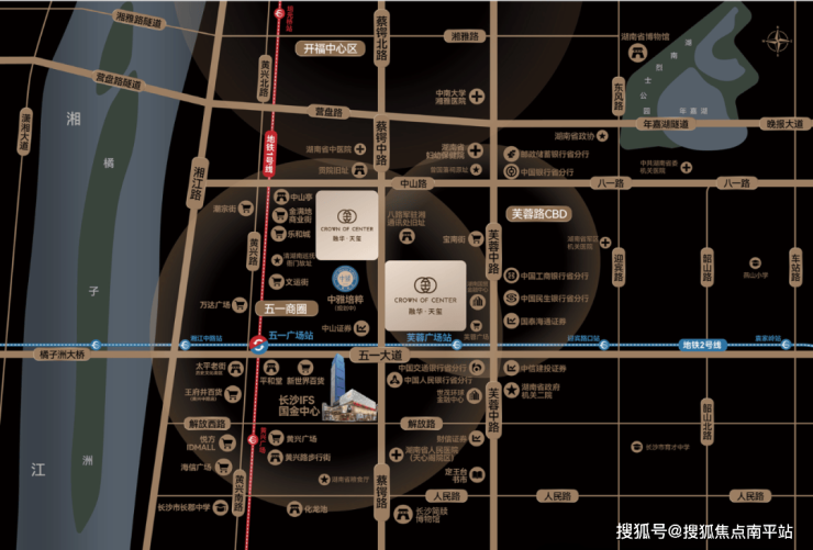项目位于芙蓉区五一路与蔡锷路交汇处,正处于五一广场和芙蓉广场中间,距离地铁1号线和2号线换乘站五一广场站约600米、2号线芙蓉广场站约100米,绝对的黄金地段。
