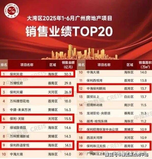 2025年上半年广州成交面积&成交金额TOP20业绩榜单保利项目独霸7席位!