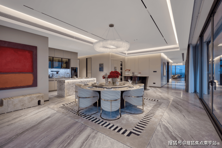 社区注重归家体验。社区入户:高颜值酒店式落客门厅,配备瑞士白大理石、艺术水景、会客等候区;单元楼入户大堂:约5 - 5.5米双层挑高入户大堂、约70㎡敞阔空间,以酒店装标打造归家仪式;地下车库入户:大堂净高约3-3.3m,采用岩板立面,全系精装搭配局部造景,优化归家体验。