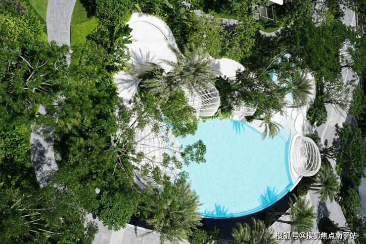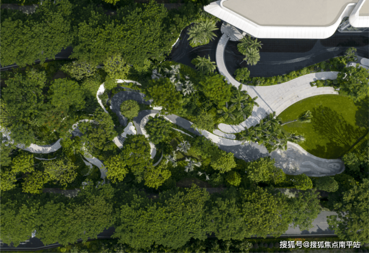 景观以“追寻人与自然的和谐关系”为核心,通过云、水、林三大自然意向的框架构建,进行多层次景观植被配比,还原自然的热带雨林。
