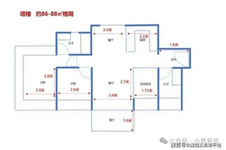 86 平方米三房同样为塔楼 2 梯 5 户配置,做到南北通透,配备 6 米宽景阳台,主卧带飘窗,采光和通风效果突出,空间利用率在同面积段中表现较好。