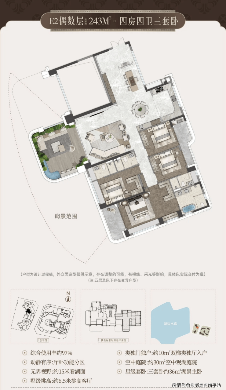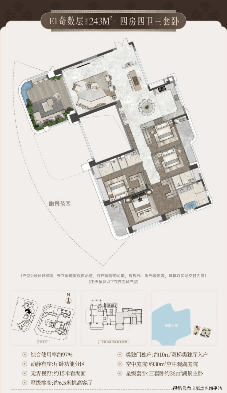 建面约288㎡「商务剧场」户型,270°环幕横厅既可以是永不散场的名利场也可以是举家欢乐的大乐园。当弧形落地窗将湖景框成天然背景墙,每个场景都自带电影级打光。