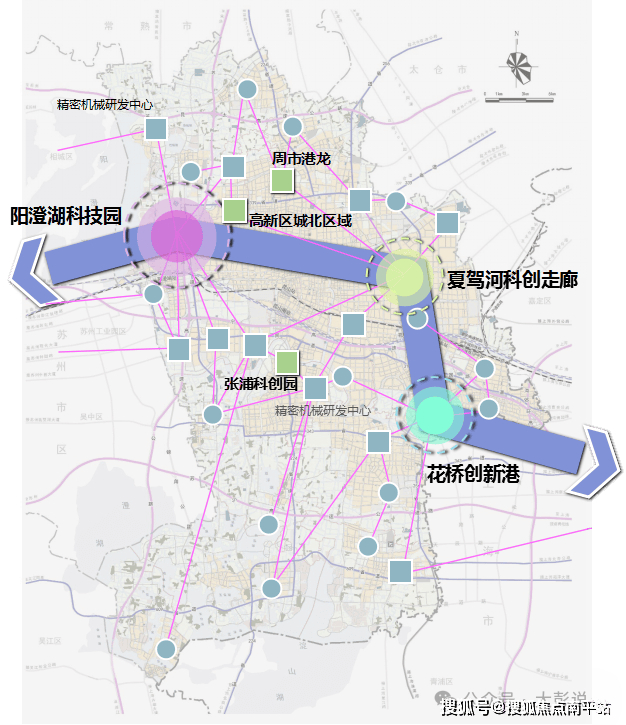 “一带四园”空间布局,形成水绿生态空间与现代科创载体的“软硬”街接,大力营造吸引高端产业、高层次人才入驻的自然生态环境和产业科创环境。