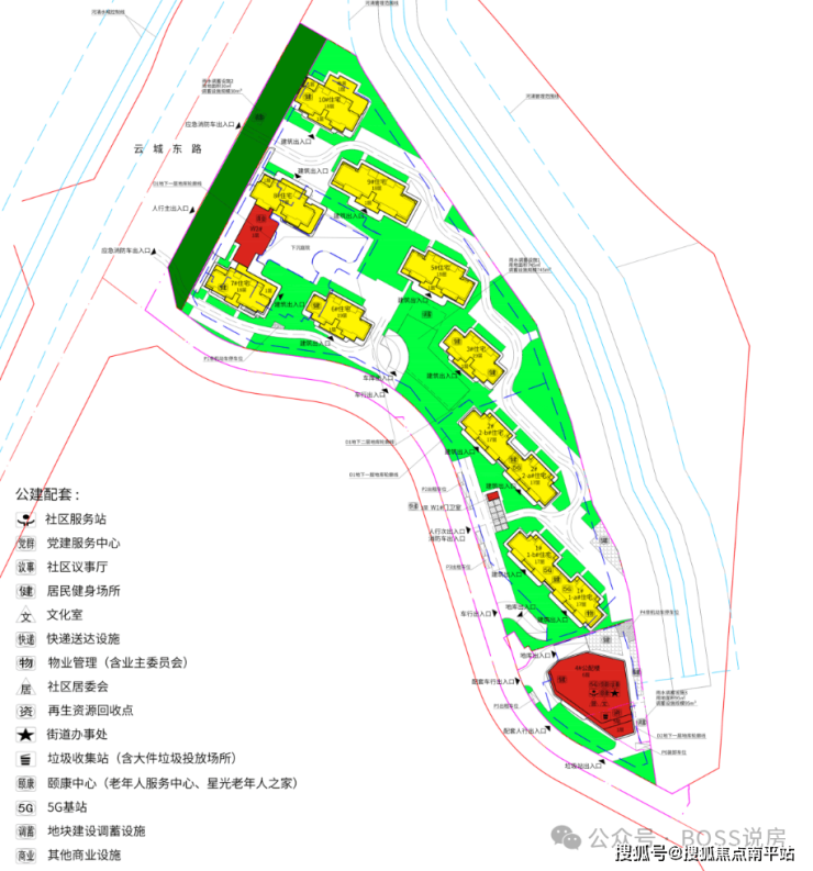 出入口规划:小区主入口位于云城东路侧,实现人车分流,车行入口与人行入口分离,保障社区内部安全与静谧。