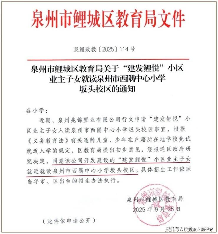 泉州市鲤城区教育局已发布官方文件《关于“建发鲤悦”小区业主子女就读泉州市西隅中心小学坂头校区的通知》,明确项目业主子女可就近入学。学校与项目直线距离仅约600米,让“优教护航”从规划变为板上钉钉的安心之选。