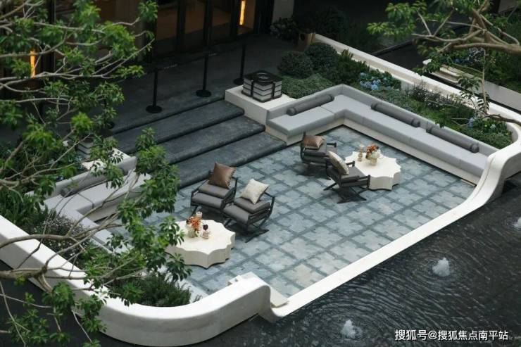 水景、绿植、雕塑围合出一个安静的场域,像把酒店中庭搬进了社区。