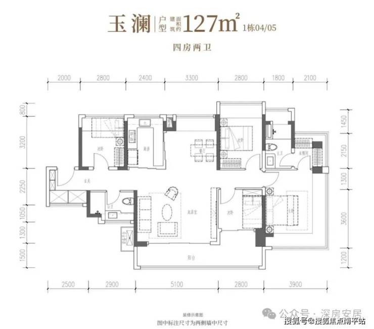 127㎡的4房2厅2卫,设计的是竖厅南北通透格局,进门独立玄关,客厅5.1米开间,客餐厅分离化设计,主卧270°无柱转角飘窗+衣帽间,卫生间干湿分离, 得房率约98.97%(包含赠送),客厅连接次卧出超大阳台约14.09平,西南或东南朝向。