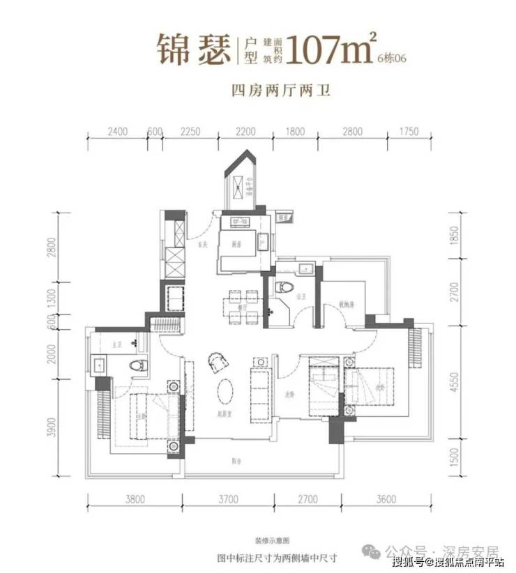 107㎡的4房2厅2卫,设计的是竖厅双龙抱珠格局,客厅3.7米开间,LDKB一体化设计,预留冰箱卡槽位,四开间朝南,主卧+2个次卧270°无柱转角飘窗,卫生间干湿分离, 得房率约104.06%(包含赠送),客厅连接次卧出超大阳台约11.76平,东北朝向。