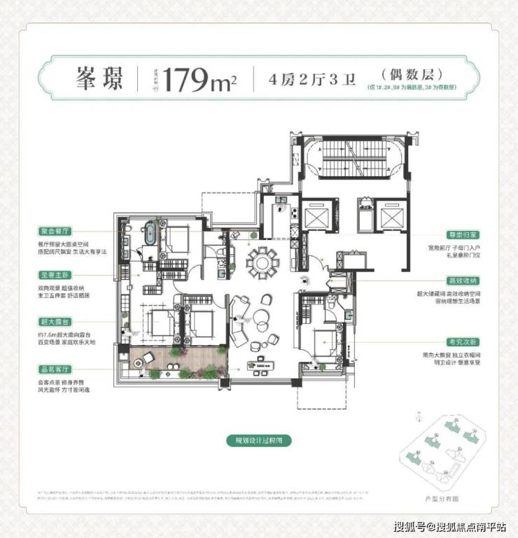 偶数层专享约7.6米南向超大露台,可化身空中花园、亲子乐园或星空餐区。奇数层南北双露台,北露台链接餐厅,南露台连接次卧,形成私密休闲区。