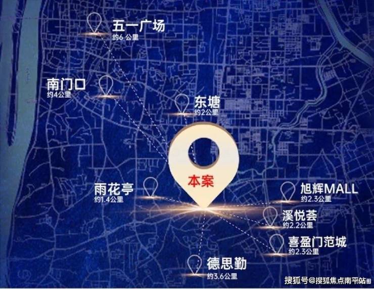 项目距雨花亭直线距离约1.4km、距离五一商圈近约6km