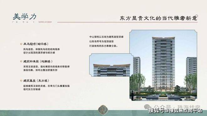 中山琅悦以玉琮为建筑造型灵感,以凤鸟符号为冠顶造型,打造独有的东方雅奢立面。