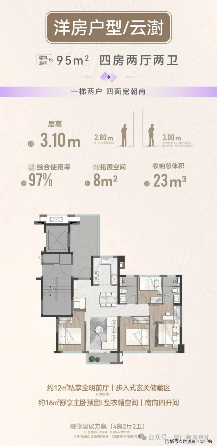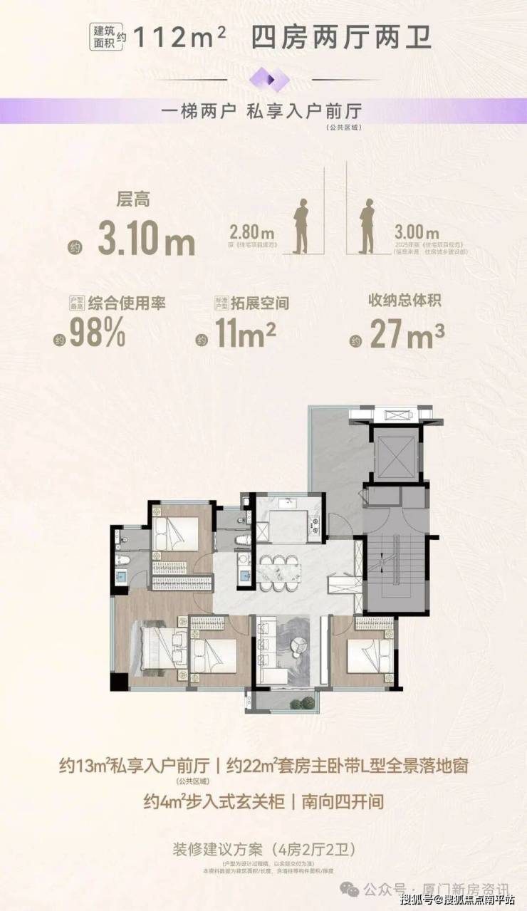 建面112m²洋房为岛内新品, 独门独户,私享约12㎡超大电梯厅,作为思明东少见的低密洋房 。3.1米层高,大露台,近100%的综合使用率。