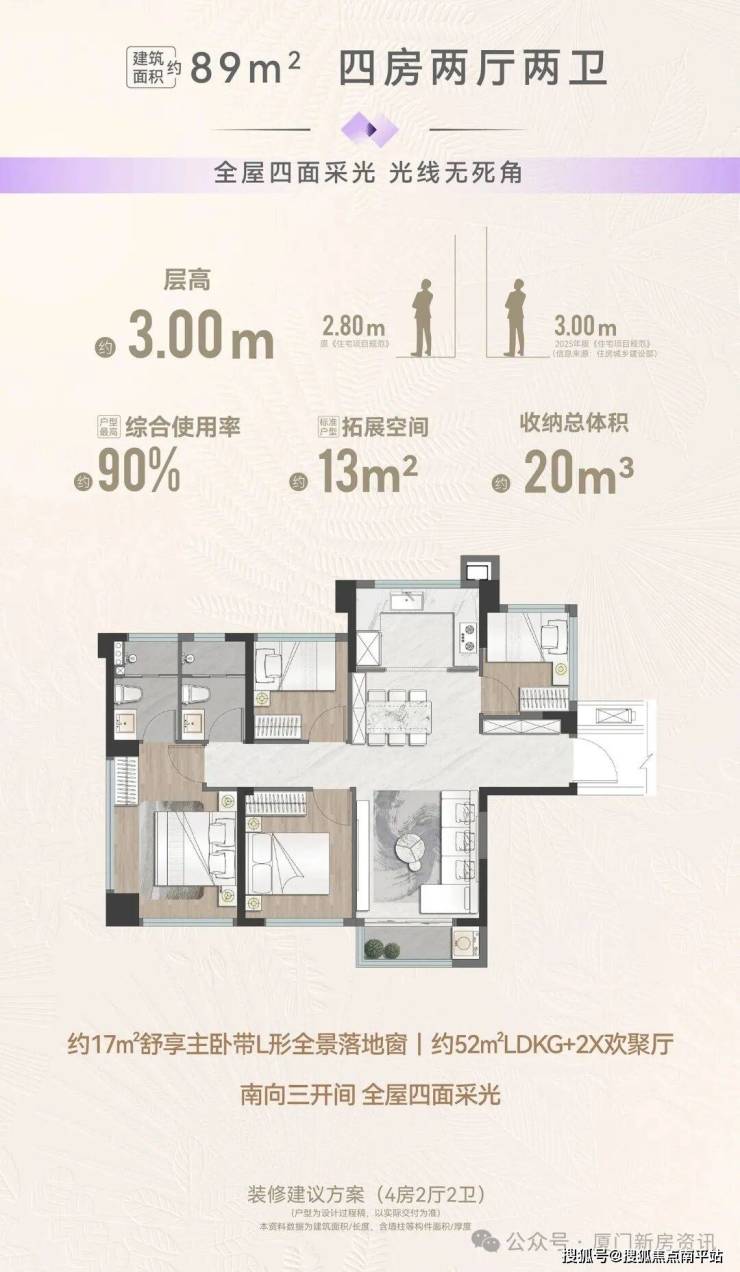 建面89㎡户型是 开创性的纯边套四房设计,南北通透,空间功能相当于 110㎡二手房、100㎡左右新房。赠送了6个全尺寸飘窗,相当于白嫖了近13㎡的空间。