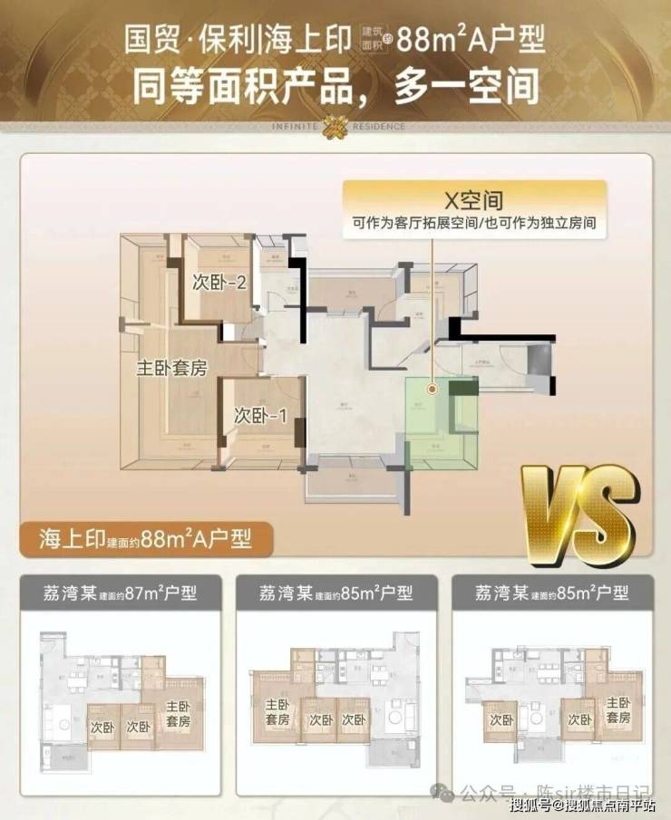 约77㎡做到3空间2卫、约88㎡做到4空间2卫、约106㎡做到南北对流使用率高的88㎡做四房,此种高使用率户型,随着新规收紧便少见。