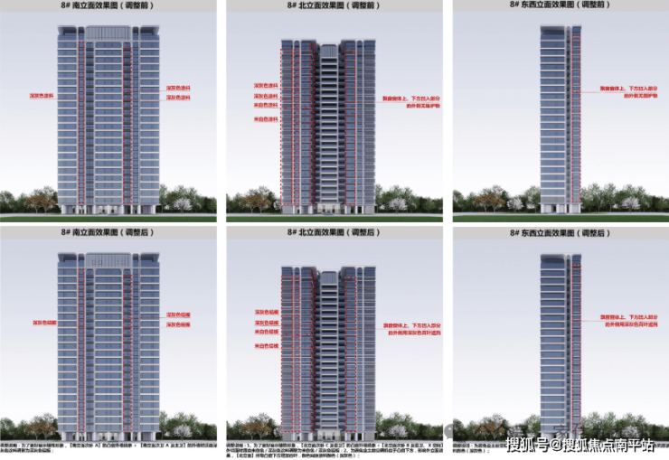 1、1#、2#、3#、5#、8#南立面局部及东西立面优化,6#、7#南北立面局部及东西立面优化,外立面材质由米白色、深灰色涂料调整为米白色、深灰色铝板;