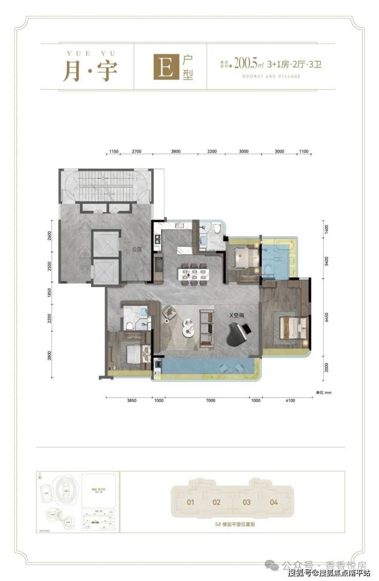 E户型: 建面约201.67㎡ 3+1房2厅3卫