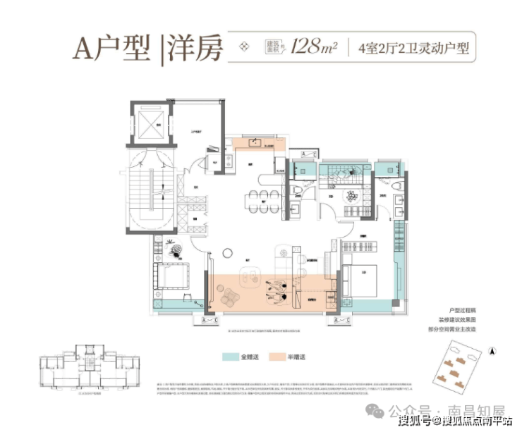 128㎡ 四房(洋房):一梯两户、南向四开间(约 14.45 米)、约 7.5米横厅、全明通透。